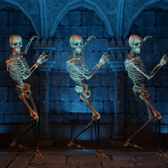 Presented in 1080p HD, Skeletal Hip-Hop comes with both castle-themed backgrounds and black backgrounds, making it highly flexible for various projection environments. Whether you’re projecting onto a garage door, window, or interior wall, the skeletons’ full-body animations are optimized to make your display pop. And with the decoration designed to loop seamlessly, the dance party can last all night long—no DJ required.
