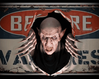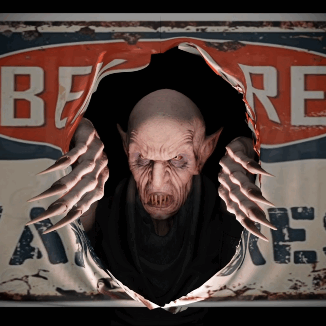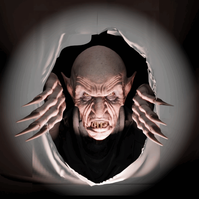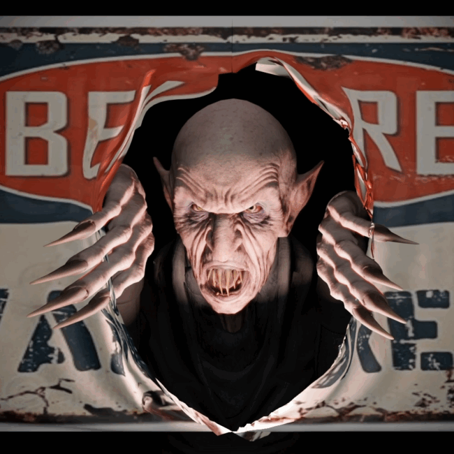 The animation is delivered in 1080p HD, with two formats to choose from: a gray background that blends naturally into walls, and a poster-style version where the vampire shreds his way through what looks like framed art. Both are designed to loop seamlessly, making them perfect for continual play on a garage door, wall, or scrim. The vampire’s movements are smooth and dramatic, ideal for sudden surprise moments that thrill kids and adults alike.