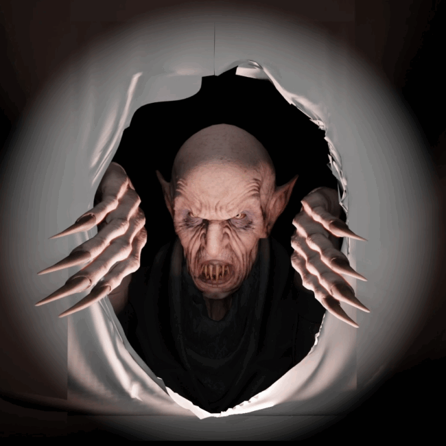 With HallowFX’s Vampire Wallbreaker, a sinister vampire literally shatters the fourth wall—emerging from your display with creepy elegance and bloodthirsty flair. This classic horror icon snarls and lunges through cracked plaster or a haunted painting, making this digital decoration a great addition to any vampire-themed or gothic haunt. It’s an easy way to add motion, character, and a touch of theatricality to your Halloween setup.